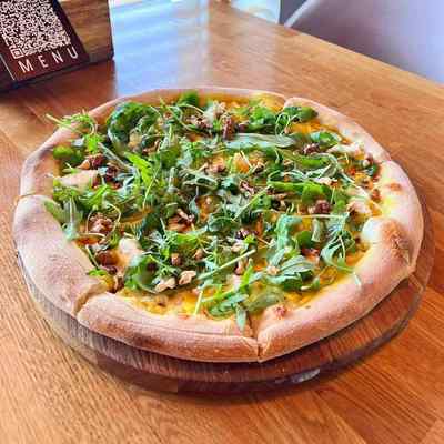 sos śmietanowo-dyniowy, mozzarella, ricotta, dynia, orzech włoski, rukola, miód