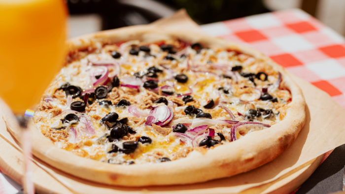 pomidory pelati/mozzarella/tuńczyk/oliwki/cebula