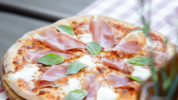 pomidory pelati/mozzarella/di bufala D.O.P./włoska szynka dojrzewająca prosciutto crudo/świeża bazylia