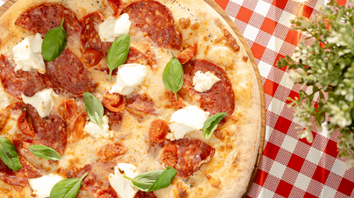 sos śmietanowo-truflowy/mozzarella/mascarpone/salami ventricina/pomidory cherry/świeża bazylia