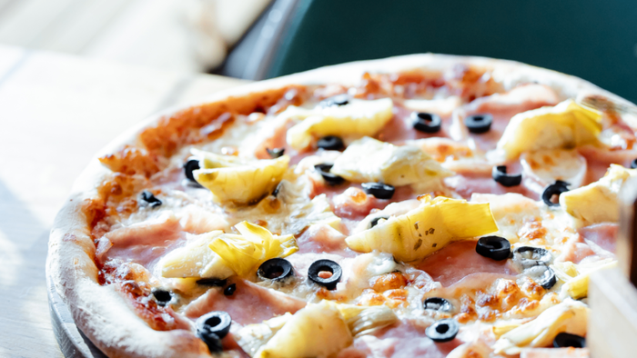 pomidory pelati/mozzarella/karczochy/włoska szynka gotowana cotto/oliwki