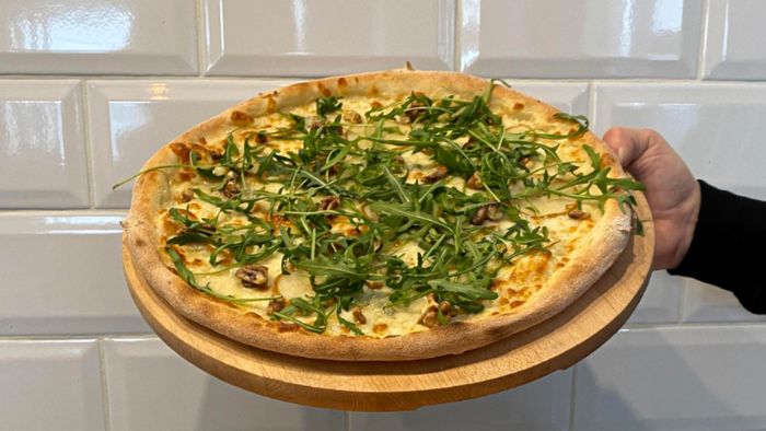 sos śmietanowy/mozzarella/gruszka/orzech włoski/gorgonzola D.O.P./rukola