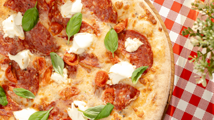 sos śmietanowo-truflowy/mozzarella/mascarpone/salami ventricina/pomidory cherry/świeża bazylia