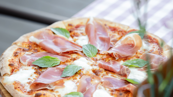 pomidory pelati/mozzarella/di bufala D.O.P./włoska szynka dojrzewająca prosciutto crudo/świeża bazylia